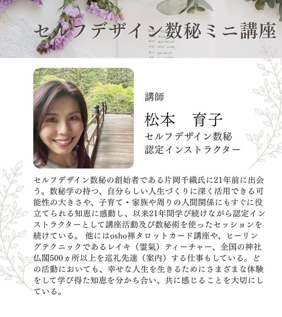 セルフデザイン数秘の創始者である片岡千織氏に22年前に出会う。数秘学の持つ、自分らしい人生づくりに深く活用できる可能性の大きさや、子育て・家族や周りの人間関係にもすぐに役立てられる知恵に感動し、以来22年間学び続けながら認定インストラクターとして講座活動及び数秘術を使ったセッションを続けている。