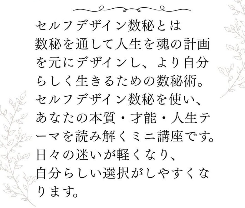 このセルフデザイン数秘鑑定は大まかな自分取説のようなものの一つとして、ご自身の可能性を文章として知りたい時に活用してください。何度も見直すことができます。